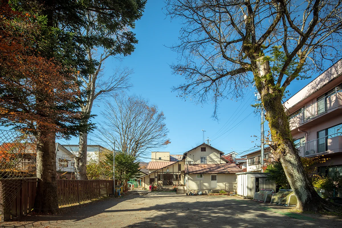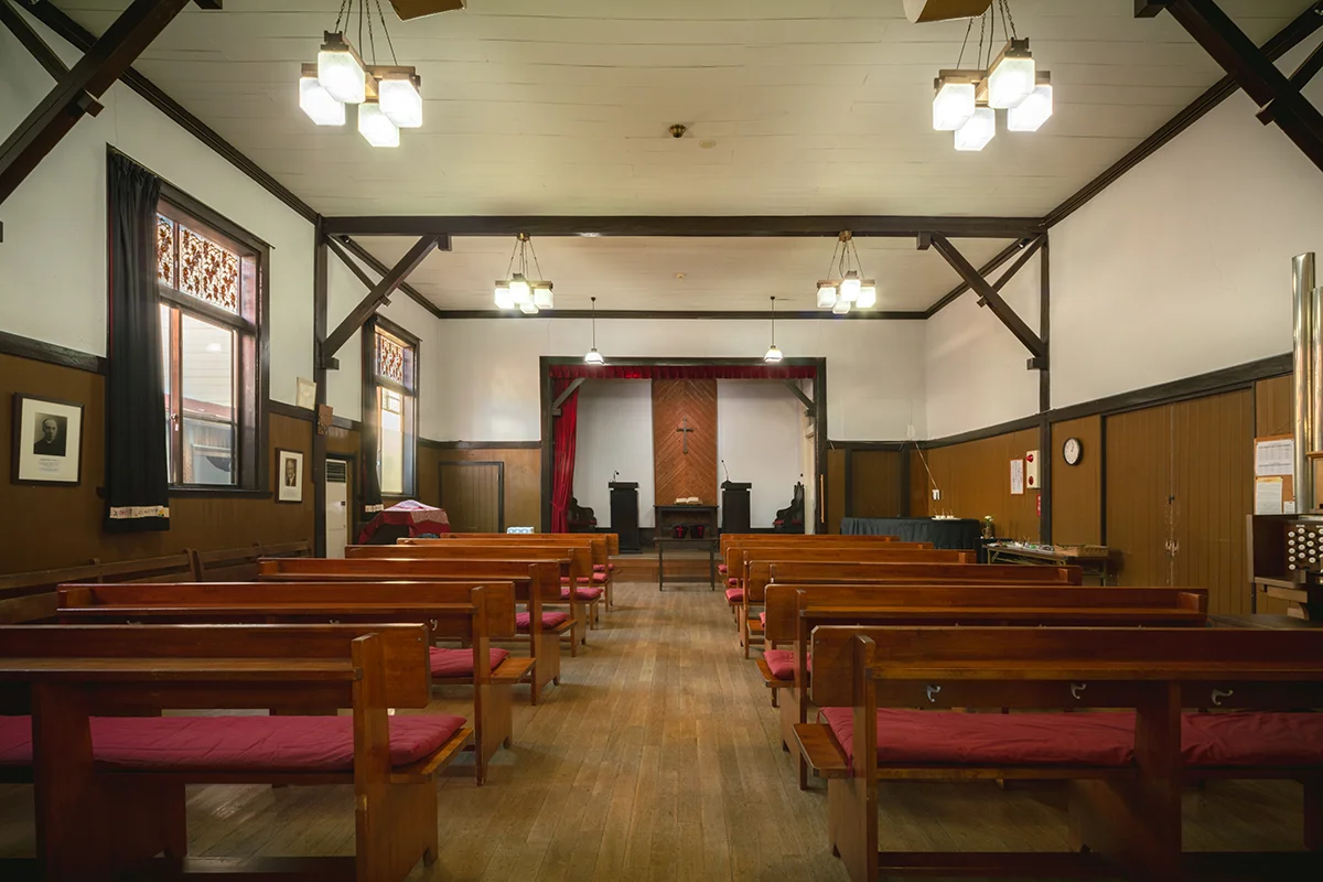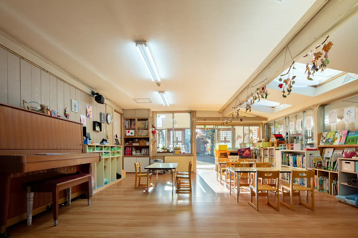 軽井沢幼稚園の会堂は、築95年を超える歴史ある建物で、入園式やお楽しみ会などの行事に使われています。旧軽銀座からは奥まった位置にあり、質素な切妻屋根や白いしっくい壁が特徴的ですが、幼稚園の入口は反対側にあります。細部を見ると、釘ではなく木組みで固定されており、歴史に裏打ちされた温かみを感じさせます。設計者が形にこだわらず、神と人が「ともに」ある場所を作ったことが、この建物の存在感を支えています。