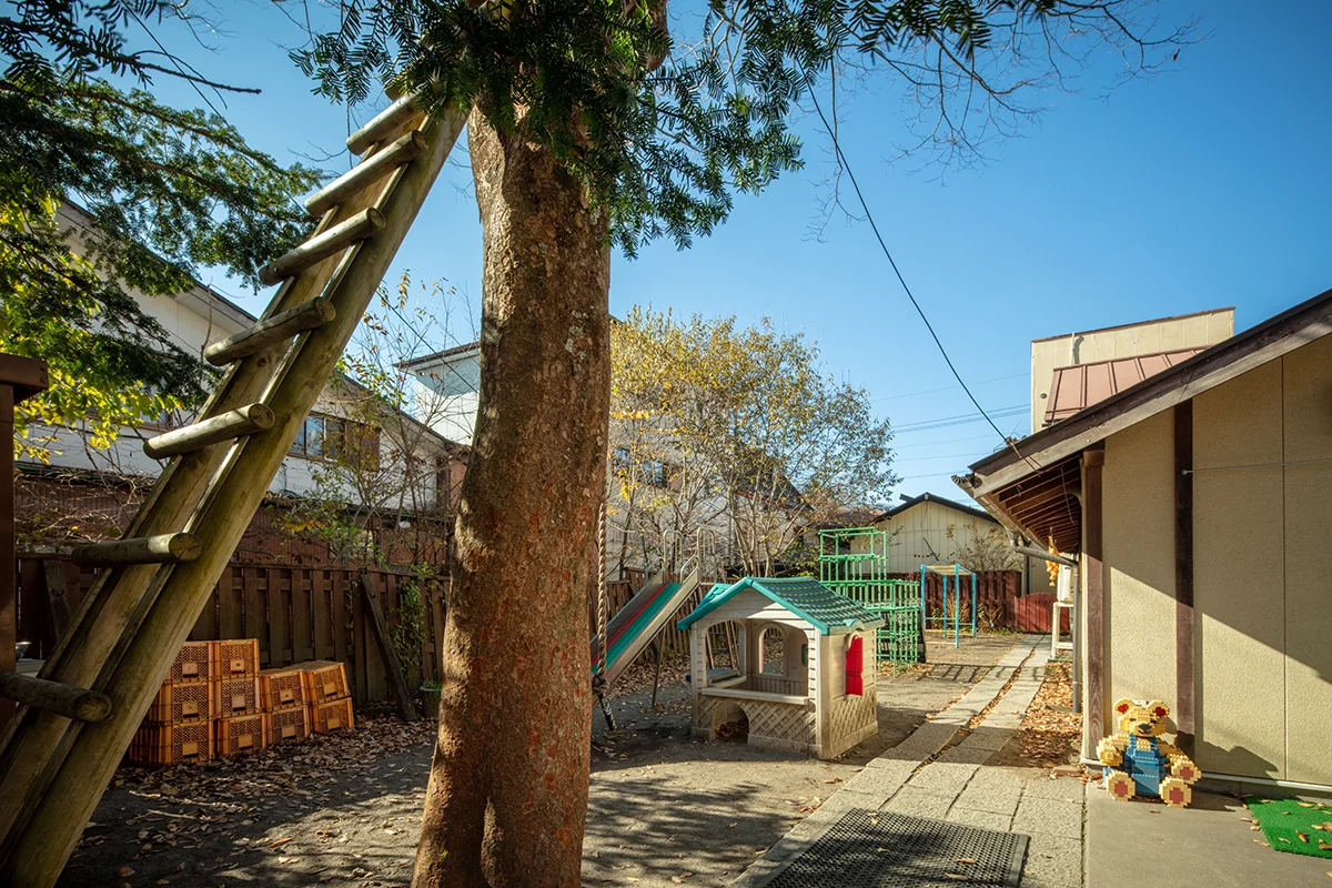 木に登ったり、草木を使って遊んだり、子どもにとって庭は自然の遊び道具がいっぱい。ジャングルジムやうんてい、滑り台などの遊具もあります。